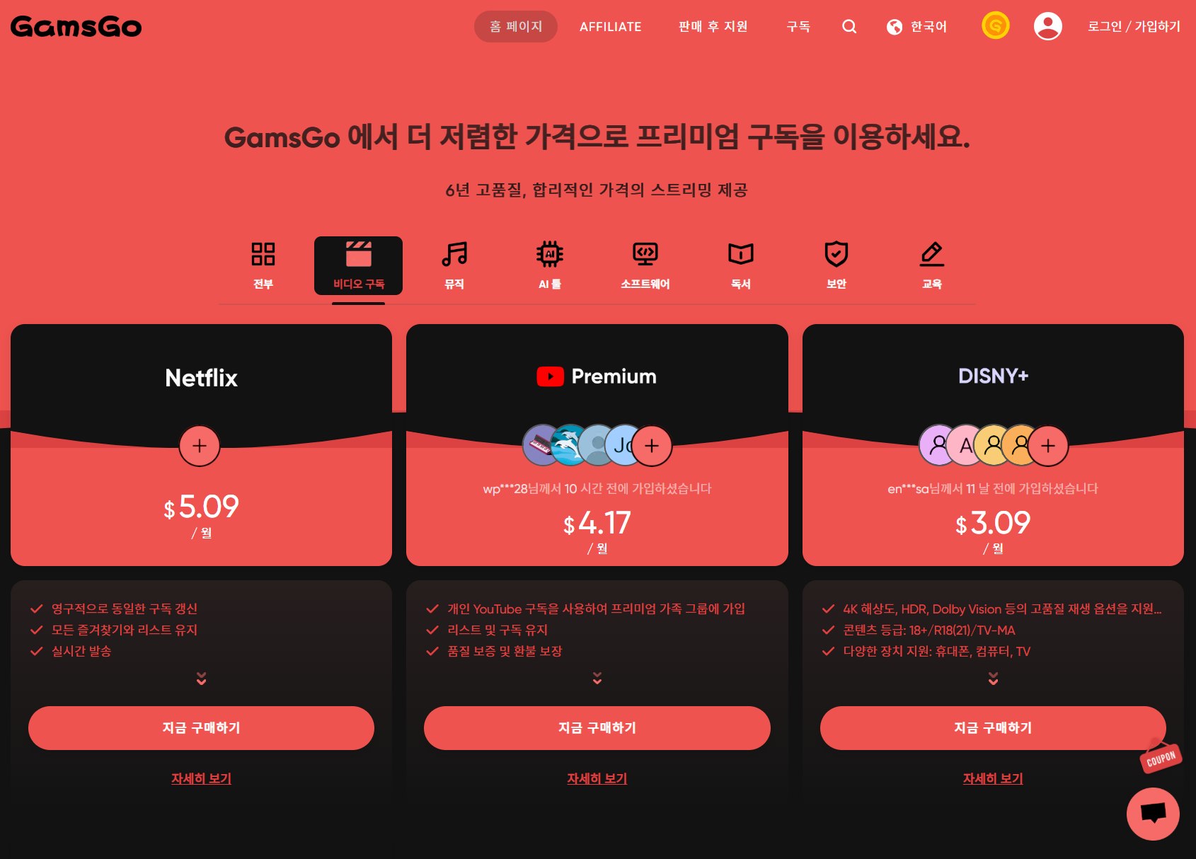 - GamsGo는 다양한 OTT 플랫폼의 프리미엄 구독을 저렴한 가격에 제공하는 서비스입니다. 예를 들어, 넷플릭스 프리미엄 요금제를 월 4,000원대로 이용할 수 있습니다. GamsGo를 통해 여러 OTT 서비스를 합리적인 가격에 즐겨보세요!